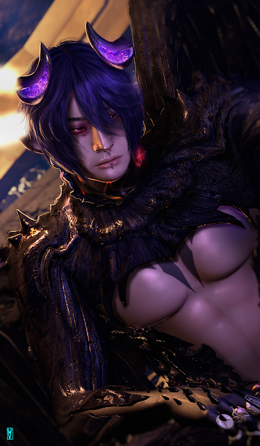 I absolutely love this outfit. I have to talk about the Blackthistle body suit by my sponor Static. This was originally rigged for women, but due to popular demand, Nama rigged it for men too which I was SOOO freakin happy about. Just look at it! Its so fantastical. And sexy too. It only comes in black, which is totally fine by me lol. Its at the Black Fair right now!. Static also made this beautiful geode-like horns which come with a very decent color HUD, which are at Kawaii Secrets event. Also at that same event, Artemisia made this stunning staff with rotating crystal and battle actions. If you look at the close up below you will see Tanaka's simple but perfect little cross septum!, it was at the latest Harajuku Event but now thats finished it will be in the mainstore.
